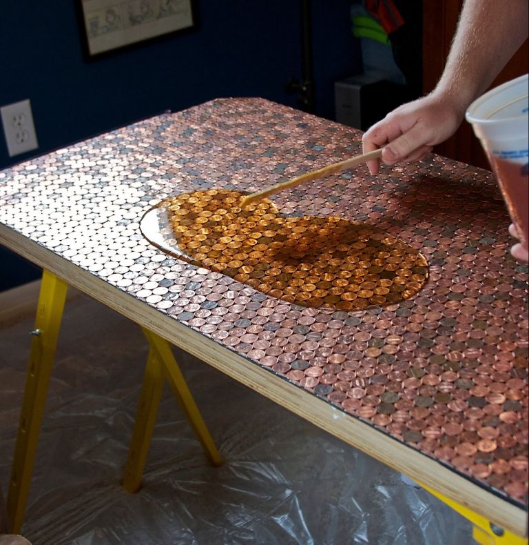 Ею можно покрыть поверхности с нанесенным предварительно рисунком или орнаментом, а также с разложенными по поверхностям мелкими декоративными элементами. При этом поверхность стола будет представлять собой интересное 3D изображение, выполненное по индивидуальному проекту.