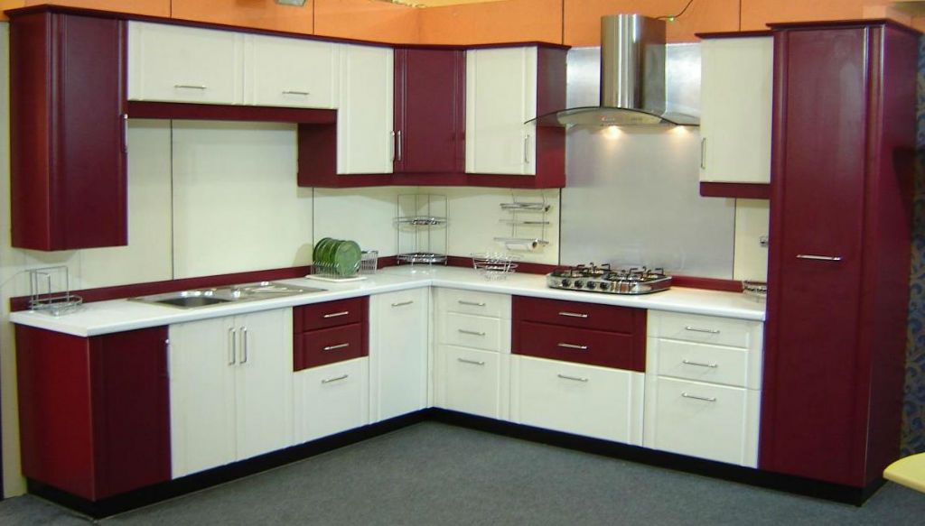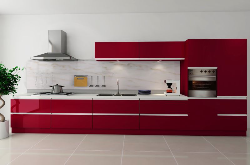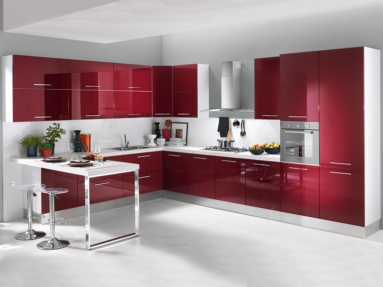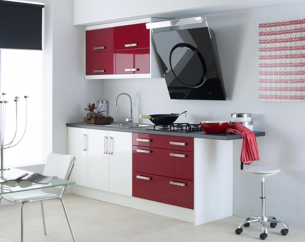 - низ красный, верх белый – напольные шкафы для посуды и утвари в рабочей зоне можно выбрать с глянцевыми блестящими фасадами насыщенного красного цвета, а навесные шкафчики оформить белым;