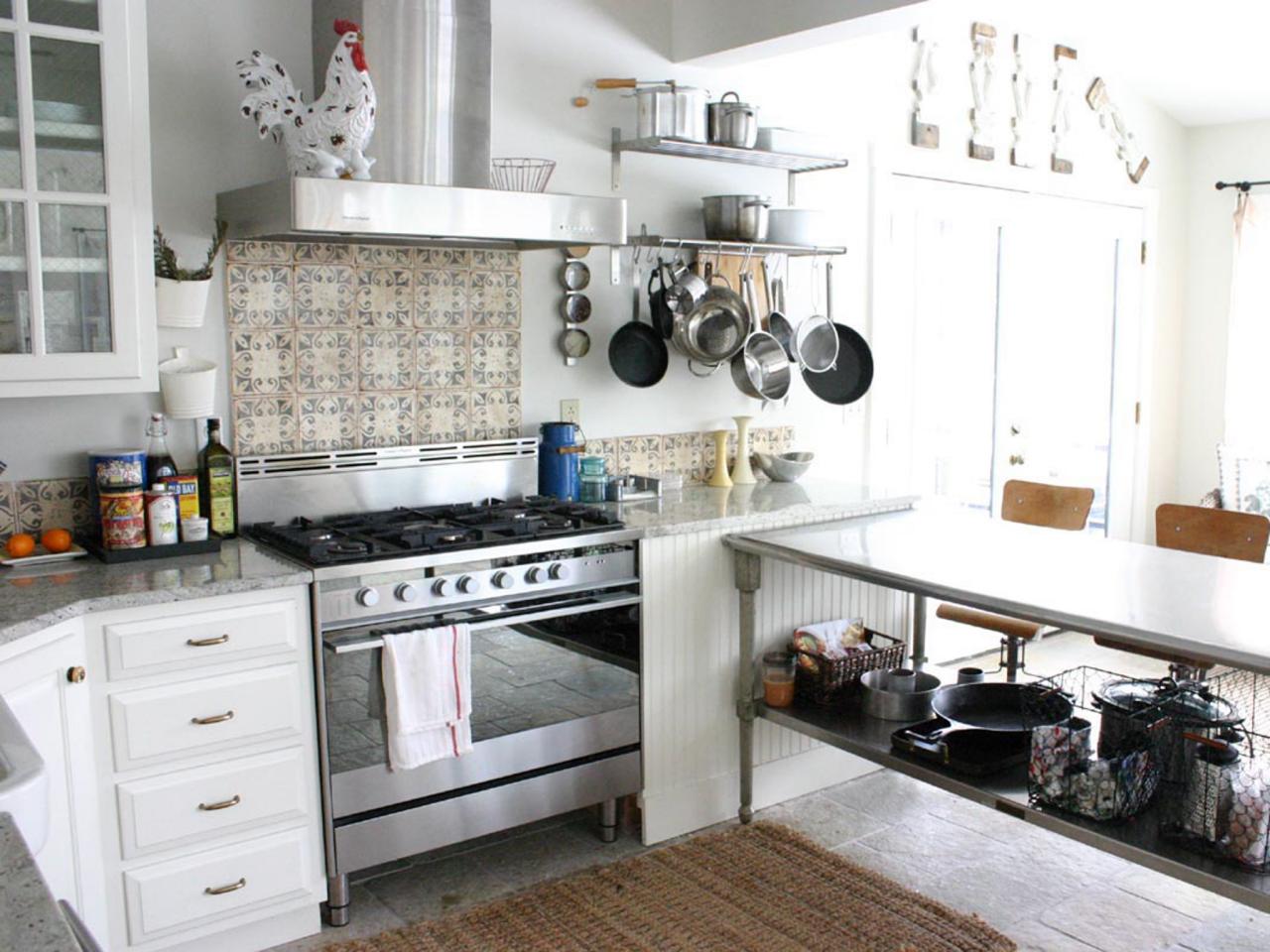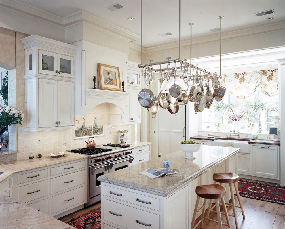 - Функциональное обустройство. Комфортное оформление интерьера кухни заключается в том, чтобы расположить все приспособления в максимально подходящем месте. Интересным решение разгрузки пространства может быть расположение на одной из стенок рейлинга – металлической трубы с множеством крючком. На нем расположатся шумовки. Маленькие кастрюльки и другие, полезные для кухни мелочи. Его лучше расположить в отдаленном от плиты и мойки месте – чтобы потом подолгу не чистить.