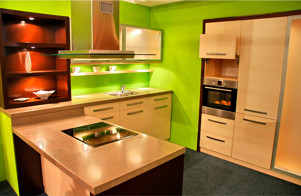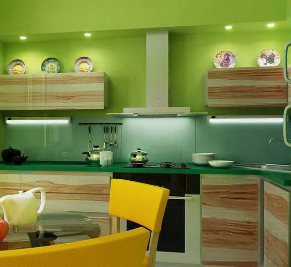 Если говорить о модных тенденциях, то на пике моды для кухонь сейчас находятся все оттенки зеленого цвета – по отзывам медиков, он благотворно влияет на пищеварение. Любая кухня будет смотреться стильно, если выкрасить стены в фисташковый или салатные оттенки зеленого цвета.