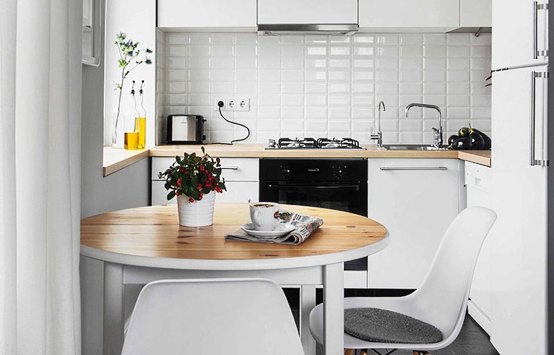Если же размеры не позволяют разместить барную стойку, тогда можно подобрать вариант с раскладным столом, который легко открывается и вмещает до четырех человек.