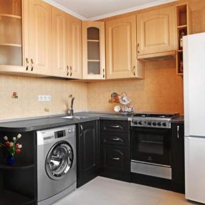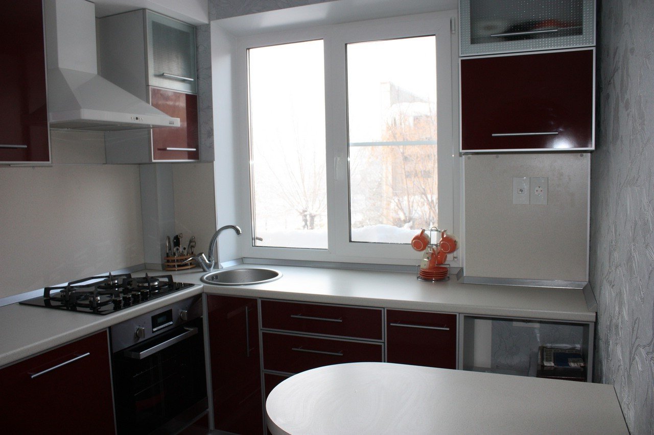 Выбирая вариант кухонного гарнитура, лучше обратить свое внимание на варианты со встроенной бытовой техникой, например, угловая кухня в хрущевке с газовой колонкой. Так пространство будет минимально заполнено различным оборудованием, а функциональность не будет отличаться от кухонь больших размеров.