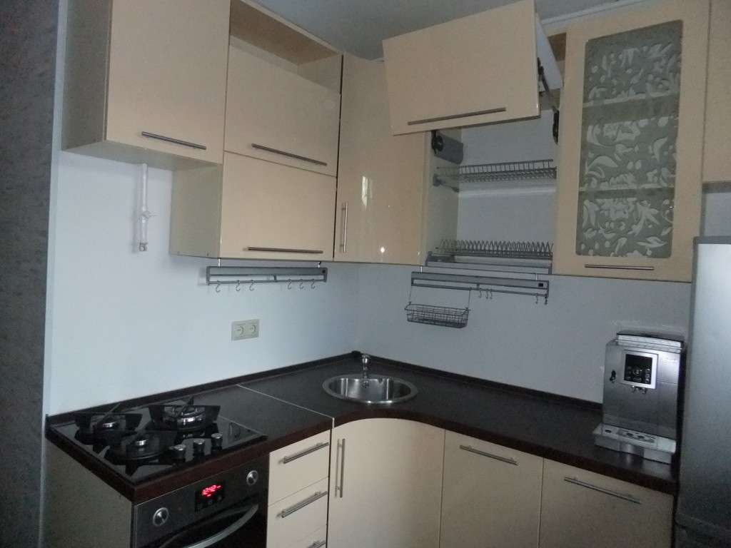 Рекомендовано использование напольных шкафов, имеющих конструкцию с выдвижными элементами. В них можно хранить крупногабаритную посуду. Внутри шкафов можно сделать отделения для хранения мелочей. Можно выполнить обстановку помещения согласно следующему плану угловой кухни в хрущевке. Одну часть гарнитура заполнить только нижними дополнительными элементами, а другую верхними моделями шкафов.